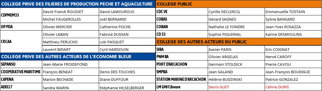 - Pour le collège privé : des représentants de la filière conchylicole – dont le Comité Régional de la Conchyliculture Arcachon Aquitaine -, des représentants de la filière pêche – dont le Comité Départemental des Pêches Maritimes et des Elevages Marins de Gironde et l’Organisation de Producteurs Pêcheurs d’Aquitaine -, le Centre pour l’Aquaculture la Pêche et l’Environnement de Nouvelle-Aquitaine, la Coopérative Maritime et la Société Pour l’Etude, la Protection et l’Aménagement de la Nature dans le Sud-Ouest.
